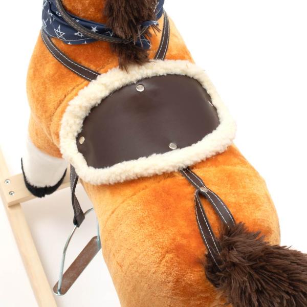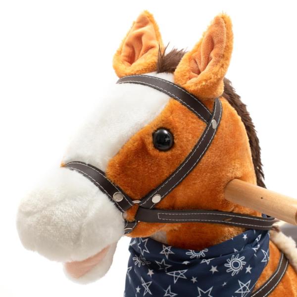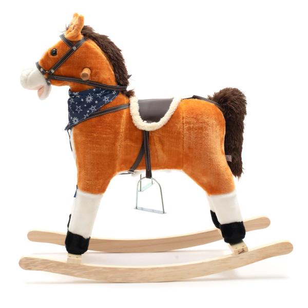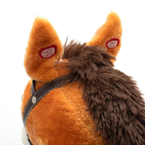 Po stisknutí uší kůň zavrtí ocáskem, otevírá ústa, vydává zvuky klusajícího koně nebo zpívá písničku. Pohodlné sedlo, pevná uzda, dřevěné rukojeti nebo kovové třmeny zajistí vašim kovbojům ještě větší stabilitu a komfort během houpání.