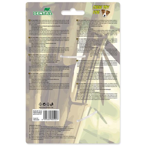 Žvýkací hračka pana Dental Bambone ve tvaru písmene Y s hovězí vůní. Určeno pro malá a střední plemena. Složení: 90% nylon, 10% bambusové vlákno Hračky pana Dental Bambones jsou zábavou pro všechny velikosti a plemena psů, které vyhledávají zábavu ve formě žvýkání. Díky dostupnosti v několika velikostech (S, M, L, S/M, L/XL), tvarech (kladivo, tyč, roh, ypsilon a kost) a vůních (kuře, hovězí a slanina) si na své přijde skutečně každý pes. I přesto, že jsou kosti aromatizované masem, nejsou určeny k konzumaci! Ze začátku je vůně velmi intenzivní, s časem postupně zmizí. Pes by tedy měl vůni hračky cítit pouze nosem, a ne jazykem a z toho důvodu by ho to nemělo lákat k konzumaci hračky. Ožvýkané strany kostí se strhávají, ale nevytvářejí ostré nitky, které by mohly psa poranit na dásních. Kost se může odlomit na menší kusy, a mohlo by dojít k náhodnému polknutí, proto nenechávejte psa bez dozoru.