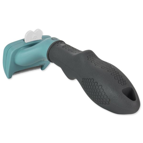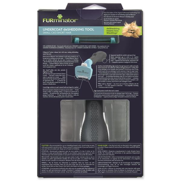 FURminator® hrábě na vyčesávání podsady pro krátkosrsté kočky malých plemen. Odstraňuje až 99% uvolněných chlupů. Pomáhá také redukovat tvorbu chlupových bezoárů. Používejte na suchou srst jednou či dvakrát týdně po dobu 10 až 20 minut. Vyčesávací hrana z nerezové oceli proniká hluboko do srsti zvířete, kde šetrně a snadno odstraňuje uvolněné chlupy z podsady, aniž by poranila kůži nebo poškodila srst. Ochranný kryt po kůži hladce klouže a brání tomu, aby se okraje vyčesávací hrany zabodávaly do kůže. Zakřivená hrana kopíruje přirozený tvar a stavbu těla zvířete, čímž se vyčesávání stává příjemnějším. Tlačítko FURejector® vyčesanou srst snadno uvolní a vyčesávání je díky tomu jednodušší než kdykoli předtím. Ochranná hrana chrání zuby, když se hrábě nepoužívá.