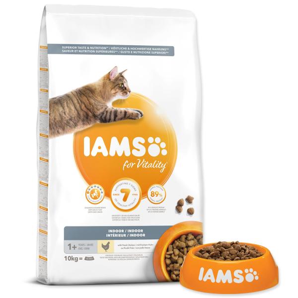 Krmivo IAMS for Vitality pro dospělé kočky a kočičí seniory žijící v bytě je 100% kompletní a vyvážené, odborníky sestavené krmivo, které bude vašemu zvířeti chutnat a svědčit. Naše nová a vylepšená receptura s čerstvým kuřecím masem je založena na kvalitních živočišných bílkovinách pečlivě vybraných tak, aby podporovaly sedm znaků zdravé vitality kočky. Aby byly kočky zdravé, aktivní a plné energie, obsahují naše lahodné receptury až 89 % živočišných bílkovin (z celkového obsahu bílkovin). Naše receptura pro kočky chované v bytě dokonale přispívá k zachování štíhlé a zdravé tělesné stavby. Našim závazkem je nabídnout kočkám specializované krmivo se skvělou chutí, které si váš domácí mazlíček bezvýhradně zamiluje a které bude podporovat všech sedm znaků zdravé vitality. Oproti našemu běžnému krmivu IAMS pro dospělé kočky s čerstvým kuřecím masem obsahuje tato receptura o 14 % méně tuku pro zachování štíhlé tělesné stavby a zdravé kondice. Díky vyváženému obsahu omega-3 a omega-6 mastných kyselin v krmivu IAMS budete moci obdivovat zdravou kůži a lesklou srst svého zvířete. Své receptury jsme vyvinuli tak, aby snižovaly pH v močové soustavě a udržely ji zdravou. Připravte se, že vaše kočka bude skákat a řádit. To díky kvalitním bílkovinám a nezbytným minerálům, které pomáhají udržet zdravé svaly a kosti. Kombinace antioxidantů s vitamínem E posiluje imunitu, takže ji už při výpravách nic neohrozí. A když ji uslyšíte chroupat naše granule s vyváženým obsahem minerálů v každém soustu, můžete si být jisti, že bude mít silné a zdravé zuby. Při úklidu kočičí toalety oceníte zdravé trávení kočky díky optimální kombinaci vlákniny, prebiotik a řepné dužiny. Naše krmiva navíc obsahují základní živiny, jako například. taurin, pro zdravé srdce, aby vám váš mazlíček nikdy nepřestal projevovat lásku. Krmivo IAMS podporuje sedm znaků zdravé vitality, které na svém zvířeti budete s radostí pozorovat každý den. Krmný návod: viz tabulka na obalu. Složení: sušené kuřecí a krůtí 43% (kuřecí 26%, přirozený zdroj taurinu), kukuřice, čirok, sušená řepná dužina (4,6%), prášková celulóza (4,6%), čerstvé kuřecí (4,1%), vepřový tuk , kuřecí šťáva, fruktooligosacharidy (0,69 %), chlorid draselný, rybí tuk, sušené pivovarské kvasnice. Jakostní znaky: hrubé proteiny 36,5 %, hrubé oleje a tuky 12 %, omega-6 mastné kyseliny 2,4 %, omega-3 mastné kyseliny 0,27 %, hrubé popeloviny 7,3 %, hrubá vláknina 6,1 % , vápník 1,4%, fosfor 1,1%, hořčík 0,093%, taurin 2000 mg / kg.