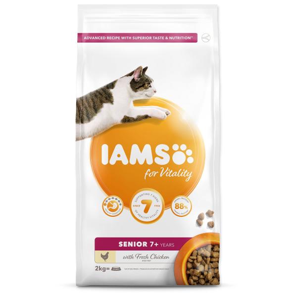 Krmivo IAMS for Vitality pro kočičí seniory je 100% kompletní a vyvážené, odborníky sestavené krmivo, které bude vašemu zvířeti chutnat a svědčit. Naše nová a vylepšená receptura pro kočičí seniory s čerstvým kuřecím masem je založena na kvalitních živočišných bílkovinách pečlivě vybraných tak, aby podporovaly sedm znaků zdravé vitality kočky. Aby byly kočky zdravé, aktivní a plné energie, obsahují naše lahodné receptury až 88 % kuřecího masa (z celkového obsahu bílkovin). Našim závazkem je nabídnout kočkám specializované krmivo se skvělou chutí, které si váš domácí mazlíček bezvýhradně zamiluje a které bude podporovat všech sedm znaků zdravé vitality. Při úklidu kočičí toalety oceníte zdravé trávení kočky díky optimální kombinaci vlákniny, prebiotik a řepné dužiny. Připravte se, že vaše kočka bude skákat a řádit. To díky kvalitním bílkovinám a nezbytným minerálům, které pomáhají udržet zdravé svaly a kosti. Díky vyváženému obsahu omega-3 a omega-6 mastných kyselin můžete obdivovat zdravou kůži a lesklou srst kočky. Své receptury jsme vyvinuli tak, aby snižovaly pH v močové soustavě a udržely ji zdravou. Kombinace antioxidantů s vitamínem E posiluje imunitu, takže ji už při výpravách nic neohrozí. A když ji uslyšíte chroupat naše granule s vyváženým obsahem minerálů v každém soustu, můžete si být jisti, že bude mít silné a zdravé zuby. Naše krmiva navíc obsahují základní živiny, jako například. taurin, pro zdravé srdce, aby vám váš mazlíček nikdy nepřestal projevovat lásku. Krmivo IAMS podporuje sedm znaků zdravé vitality, které můžete s radostí pozorovat každý den. Krmný návod: viz tabulka na obalu. Složení: sušené kuřecí a krůtí 42% (kuřecí 25%, přirozený zdroj taurinu), kukuřice, čirok, čerstvé kuřecí (4,1%), vepřový tuk, sušená řepná dužina (2,4%), kuřecí šťáva, kukuřičná krup fruktooligosacharidy ,69 %), chlorid draselný, rybí tuk, sušené pivovarské kvasnice, glukosamin (z živočišné tkáně) (0,04 %). Jakostní znaky: hrubé proteiny 36 %, hrubé oleje a tuky 12,5 %, omega-6 mastné kyseliny 2,5 %, omega-3 mastné kyseliny 0,27 %, hrubé popeloviny 7,3 %, hrubá vláknina 1,9 % , vápník 1,4%, fosfor 1,2%, hořčík 0,095%, taurin 2000 mg / kg.