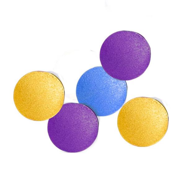 5 kapek do koupele (2x purpurová, 2x žlutá, 1x modrá).