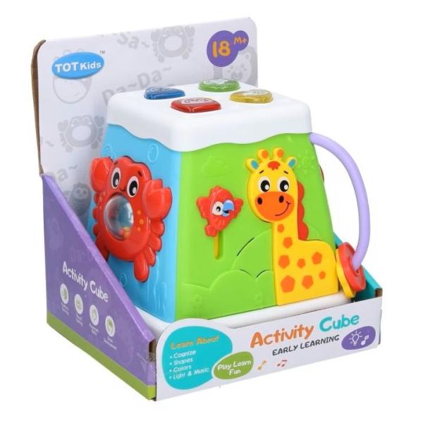 Interaktivní kostka pro nejmenší, plná světelných a zvukových efektů, 13 cm velké.