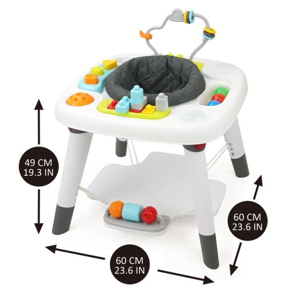 Interakce jsou založeny na 3v1, takže je můžete zkusit porazit. Upozorňujeme, že dnes budete moci vidět, jak lze motory ovládat. Nyní si každá batole může hrát doslova „s sebou“! Zastavme se dnes a zjistíme víc! Prosím dej mi vědět • Dítě poznává svět v sedě v sedadle. Hračky položené na stole se mohou dotýkat rukama a díky pohyblivé plošině procvičovat nohy. Druhou fází je naučit se chodit is hračkami. • Když to uvidíte, budete muset zůstat v místnosti. Pohybuje se kolem stolu, na kterém jsou umístěny barevné a interaktivní hračky. Třetí fáze – nebezpečná zábava! • Poprvé jste slyšeli funkční kus nábytku, kde může jíst, hrát si nebo hrát hry. Nosnost : 9 kg Velikost produktu : 60 x 60 x 49 cm Baterie 2xAA nejsou dostupné. Vhodné pro děti od 6 měsíců .