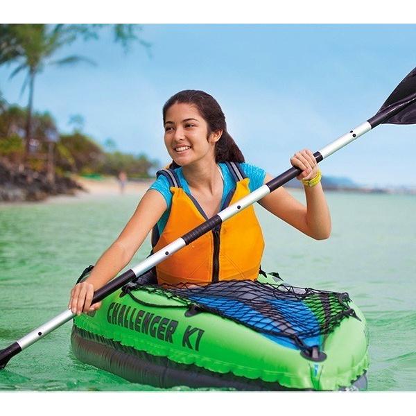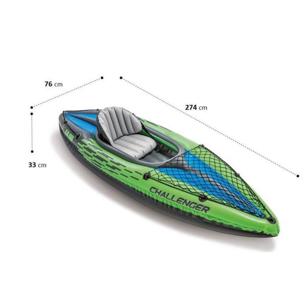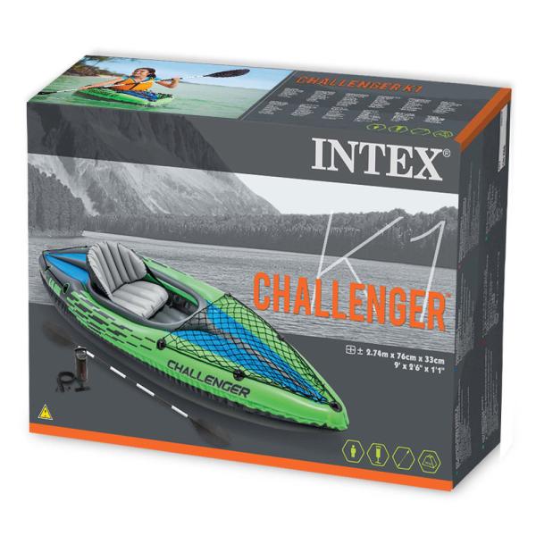 Intex nafukovací člun Challenger Kajak K1 68305, výrobce Intex. Vynikající jedno místní kajak, snadno použitelný na moři, jezerech a mírných splavech řek: jednomístný kajak, oboustranně činnou pumpu, alu ve1slo rozměry po nafouknutí: 274 x 76 x 38 cm, nosnost: 1 osoba / 100 kg provaz po obvodu lodi tloušťka stěn 0,75 mm sada na lepení oko na ukotvení kajaku Pro jednu osobu