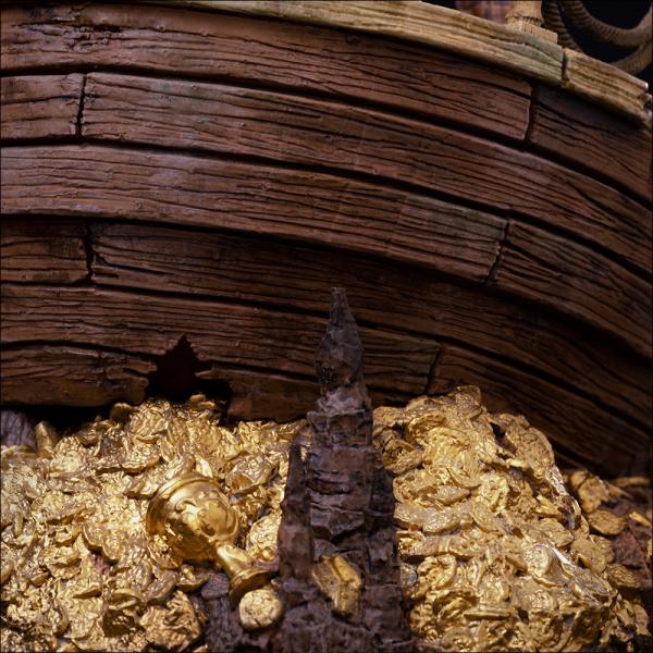 Bohatý dioramatický podstavec v podobě zadní části rozpadající se pirátské galéry.