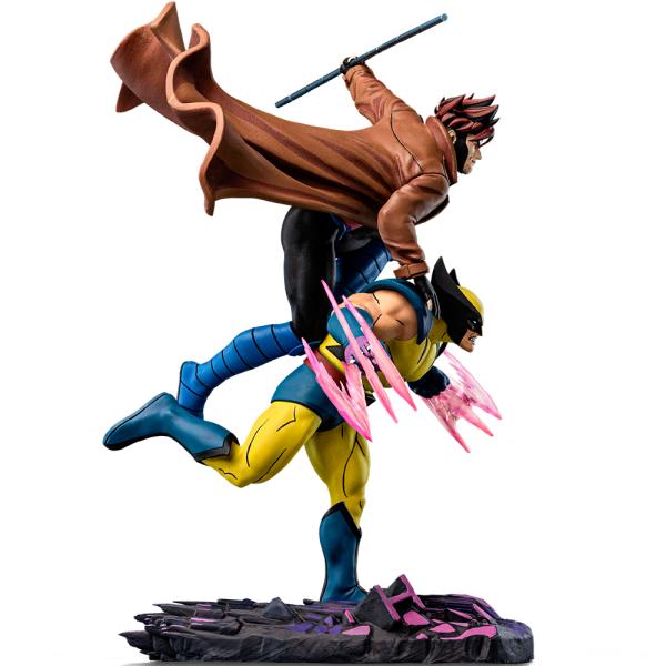 Figurka Gambit & Wolverine – X-Men ’97 – Deluxe Art Scale 1/10 od Iron Studios zachycuje ikonické duo mutantů X-Men v akci na suchém terénu z kamenů, štěrku a obláčků. Wolverine se vrhá vpřed s rozpaženýma rukama a vysunutými drápy, které prořezávají vzduch kinetickou energií, zatímco Gambit se opírá o jeho záda, v levé ruce drží vysouvací Bojutsu staff a naklání tělo vpřed připraven skočit do boje. Figurka přináší inovativní cel shading stínování, díky kterému postavy vypadají, jako by vystupovaly přímo z televizní obrazovky do reálného světa. Inspirováno animovaným seriálem X-Men ’97 (2024) na Disney+.
