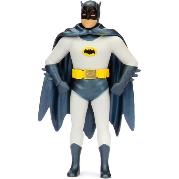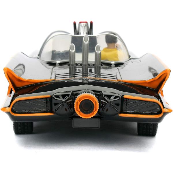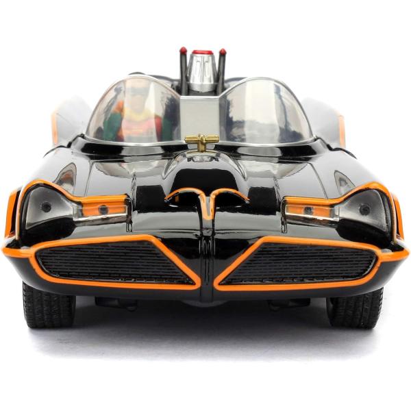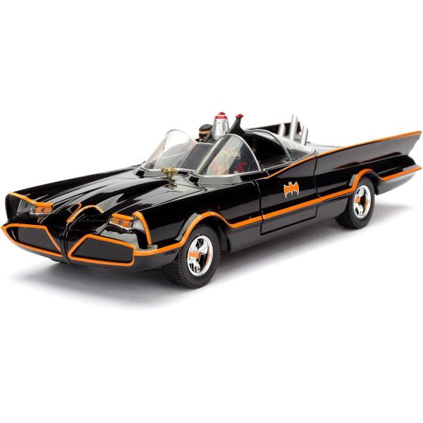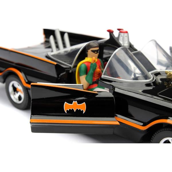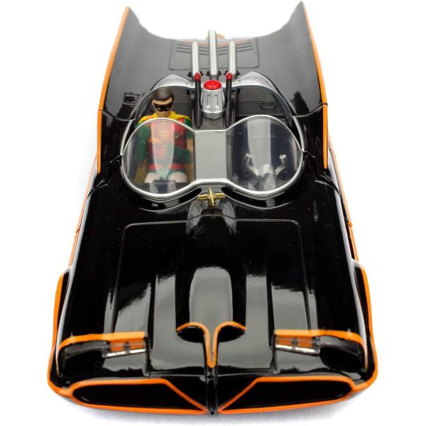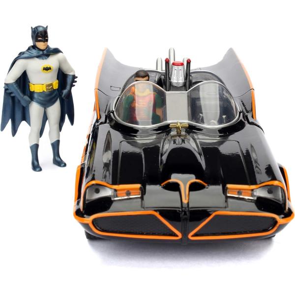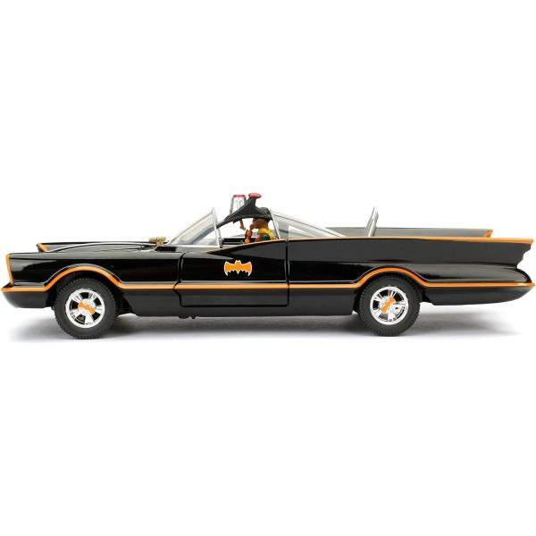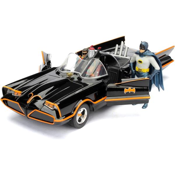 Kovový model Batman 1966 Classic Batmobile pro volnoběh v měřítku 1:24, s otevíracími dveřmi a kovovou figurkou Batmana. Batmanova sbírka není úplná bez ikonického Batmobilu z roku 1966 Kovové auto v měřítku 1:24 s gumovými koly Obsahuje 7 cm kovovou figurku batmana a neodnímatelnou figurku robina v autě. Dveře se otevírají. Pro děti od 8 let
