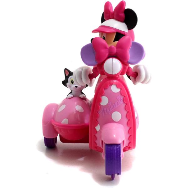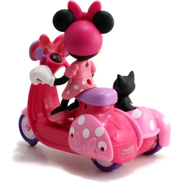 IRC scooter se sajdkárou s figurkou Minnie a kočičkou, 1 kanál, jezdí dopředu, dozadu se zatáčením. Velikost 19 cm. Baterie ovladač 2x 1,5V R03, scooter 3x 1,5V R6, baterie nejsou součástí. Vlastnosti: koloběžka s bočním přívěsem. za volantem sedí Minnie Mouse oblečená v růžových tečkovaných šatech, růžových bačkůrkách a helmě s mašlí. na cestě ji doprovází černobílá kočička, která sedí v bočním přívěsu. koloběžka na dálkové ovládání je růžová a má 3 kolečka dálkové ovládání umožňuje koloběžce jezdit dopředu, dozadu a otáčet se jedním směrem postavičku nelze z vozidla vyjmout. 1-kanálové vozidlo frekvence 2,4 Ghz dosahuje rychlosti až 2,5 km/h. potřebné baterie – 3 x 1,5 V LR06/AA + 2 x 1,5 V LR03/AA – baterie nejsou součástí dodávky