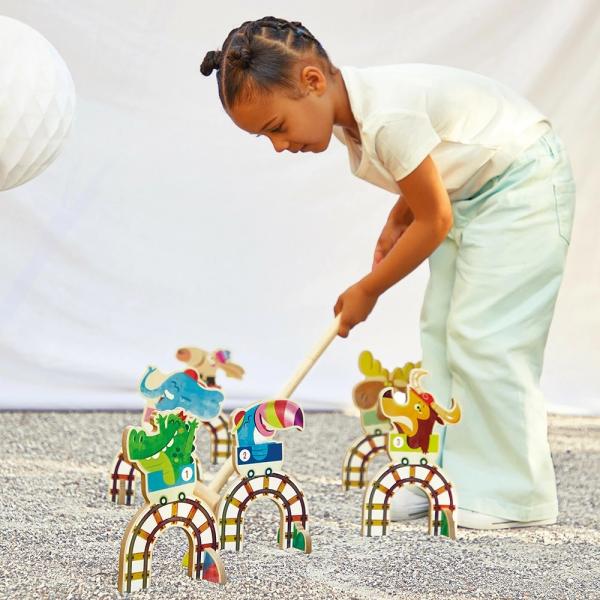 Zvedněte ruce, atrakce právě začíná! Připravte se na vzrušující dobrodružství s touto dřevěnou kroketovou hrou určenou pro děti od 3 let! Tato hra byla navržena tak, aby zajistila mnoho hodin zábavy a smíchu pro 2 nebo více hráčů, a proto obsahuje: 6 barevných kruhů, 2 paličky a 2 dřevěné míčky.Tato dovednostní hra ve stylu lunaparku je zdobena živými, barevnými barvami.