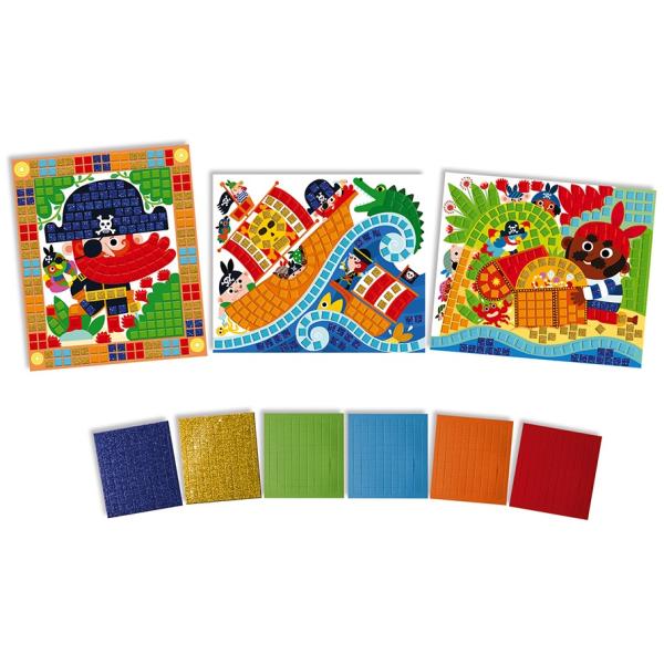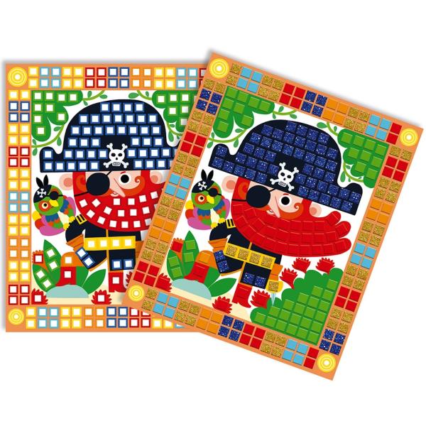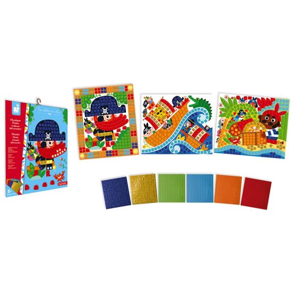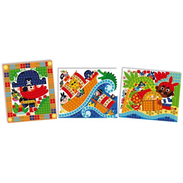 Kreativní sada na tvoření Mozaika Piráti Janod Atelier Mini obsahuje 3 karty s krásnými motivy pirátů a 6 archů papíru s barevnou mozaikou.