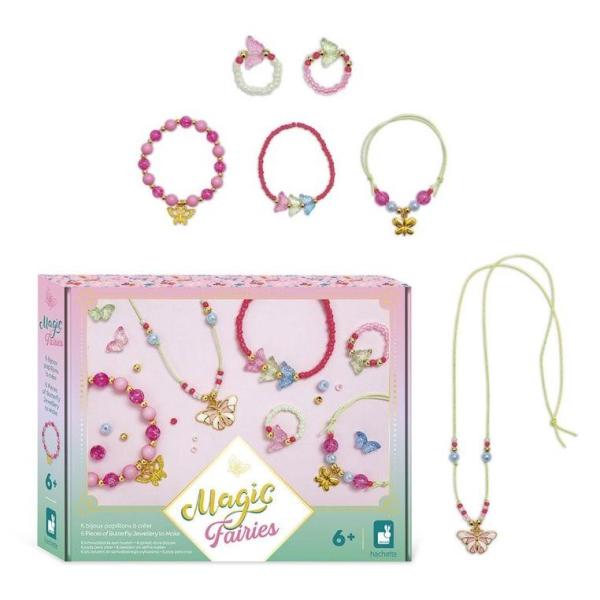 Kreativní sada na výrobu šperků francouzské víly značky JANOD vám umožní vytvořit celkem až 6 kusů ozdob: náhrdelník, 3 náramky a 2 prsteny. Její součástí je mnoho korálků v různých tvarech a barvách (m.in. ve tvaru motýlů), stejně jako světle zelený provázek, bílá elastická nit a 3 kovové přívěsky-motýly.