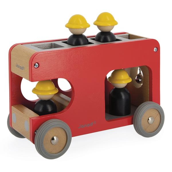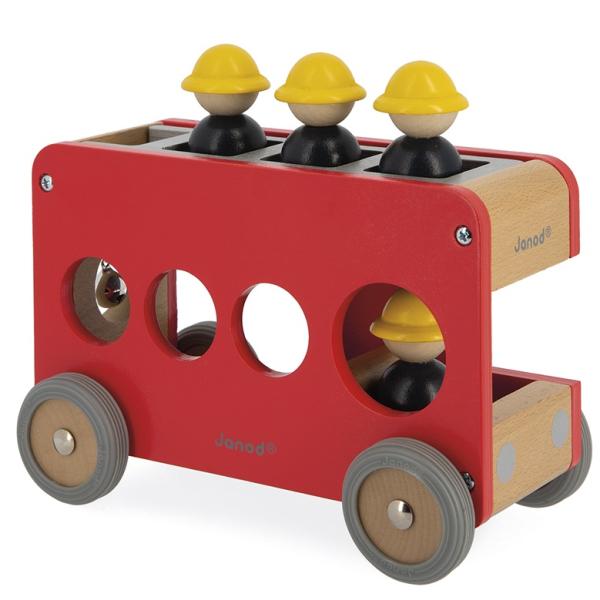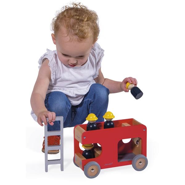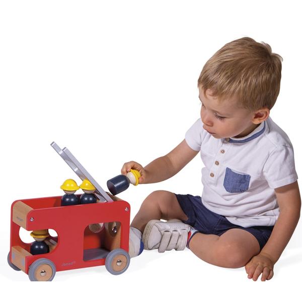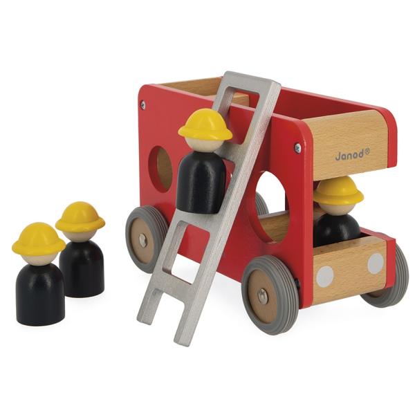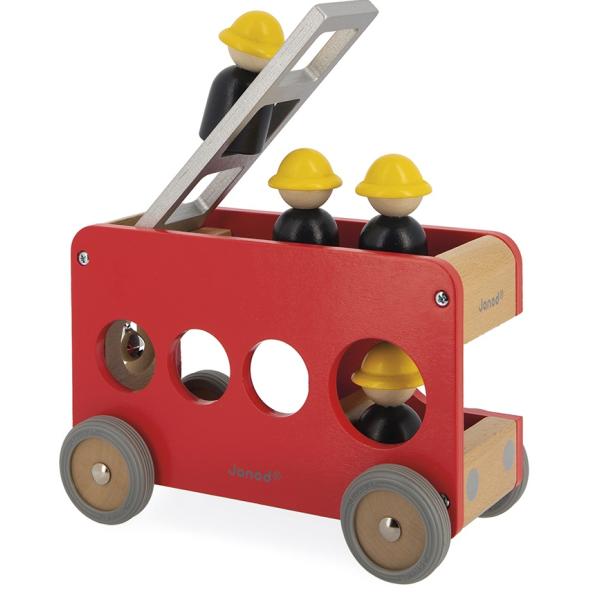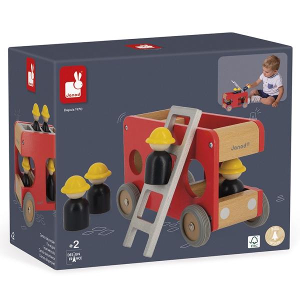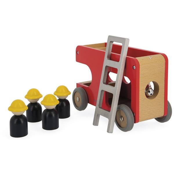 ‚Fijú – fijú – fijú…!!‘ Vysune se velký žebřík, hasiči vyskočí z auta a musí rychle hasit! Rozvíjejte fantazii svého dítěte s těmito 4 hasiči a jejich nádherným dřevěným autem. Auto je vybaveno odnímatelným žebříkem a malým zvonkem, abyste věděli, že se blíží. Vozík má gumová kola, která jsou dokonale tichá.