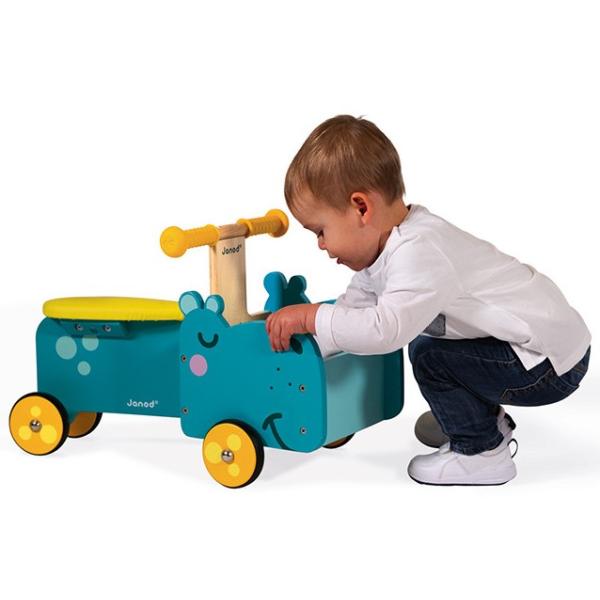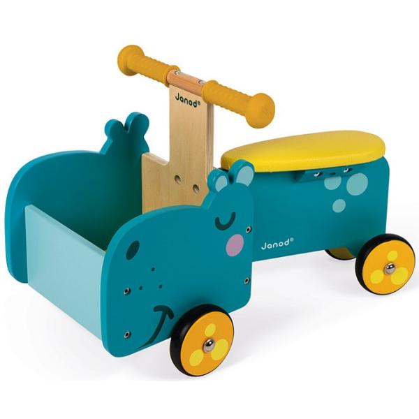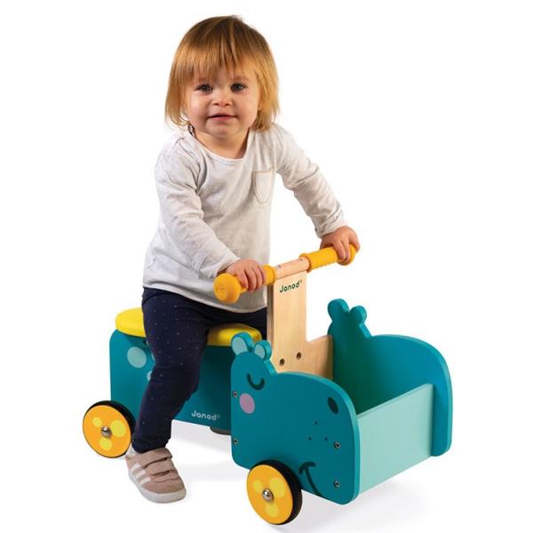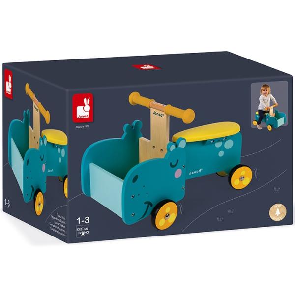Dřevěné odrážedlo pro nejmenší Hroch Janod s vozíkem na hračky. Tato krásná a trendová hračka ve tvaru hrocha je ideální pro rozvoj motorických schopností a rovnováhy vašeho dítěte.