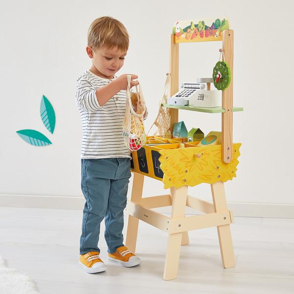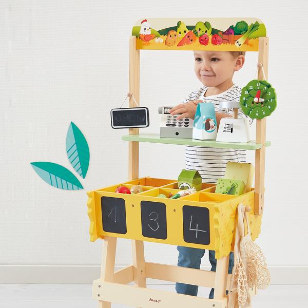 Tato předstíraná dřevěná hračka podnítí nejmenší, aby vymysleli spoustu příběhů a podělili se s ostatními! Navíc je vždy zajímavé naučit se vystavovat produkty na poličce nebo se dopracovat k jejich ceně. Díky svému malému stánku s potravinami mohou batolata kromě fantazie a slovní zásoby rozvíjet také své sociální a kognitivní schopnosti! Tato předstíraná hračka jim pomáhá lépe pochopit, jak funguje nakupování a vaření. Malé děti mají zaručeno spoustu zábavných hodin, když čekají na zákazníky, aby si koupili jejich místní produkty!