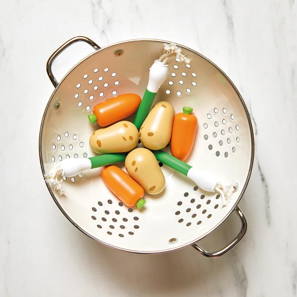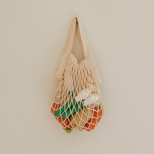 Stejně jako dospělí, i malí mohou zeleninu před předáním zákazníkům zabalit do kraftového papíru. Kromě toho jsou součástí balení 2 síťované nákupní tašky, které dají zákazníkům, kteří dělají velký nákup potravin: praktické, opakovaně použitelné a velmi realistické! Mimořádně praktické: 3 dřevěné kolíky pojmou tašky nebo jiné příslušenství na trhu.