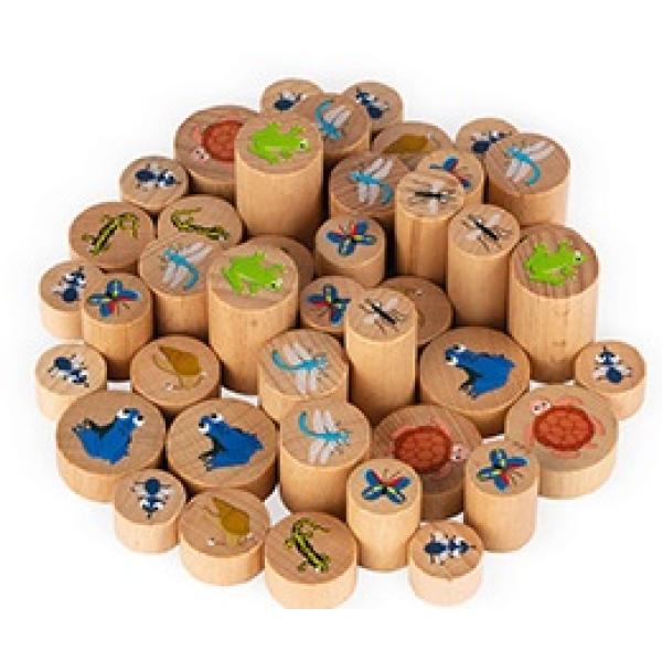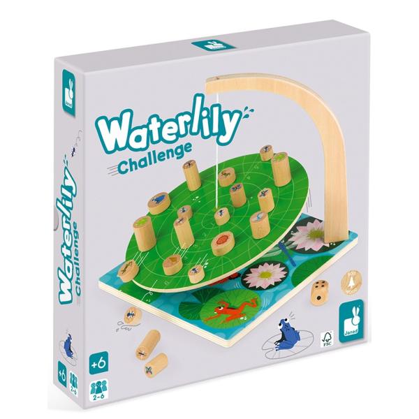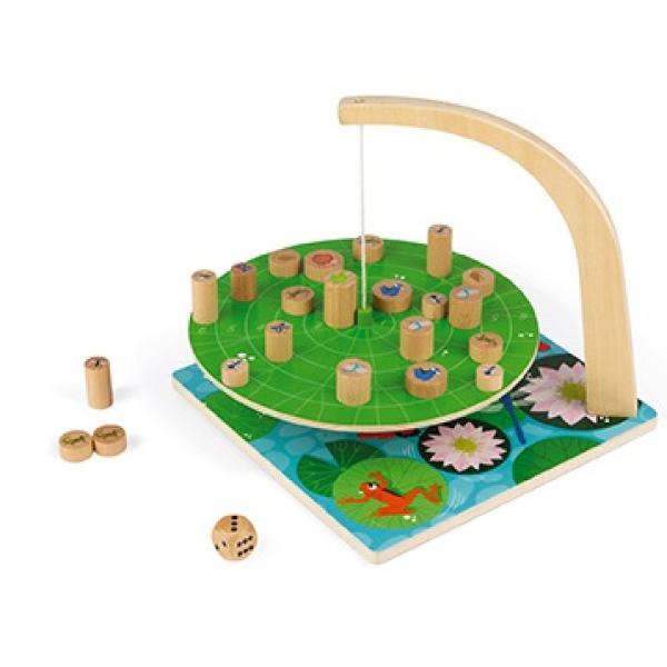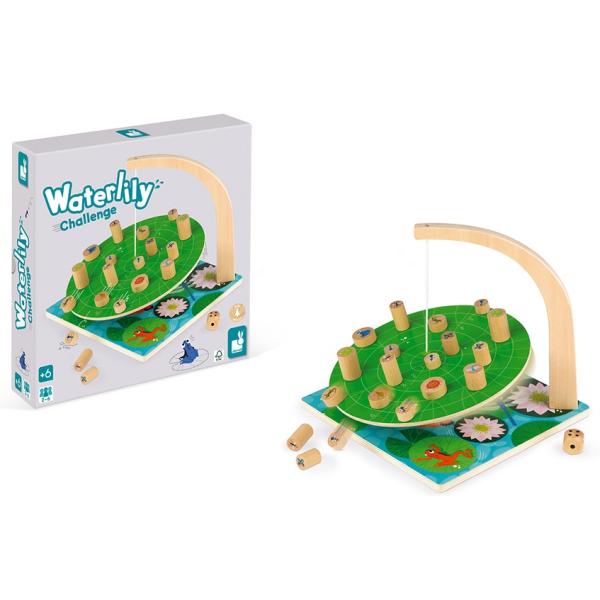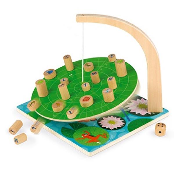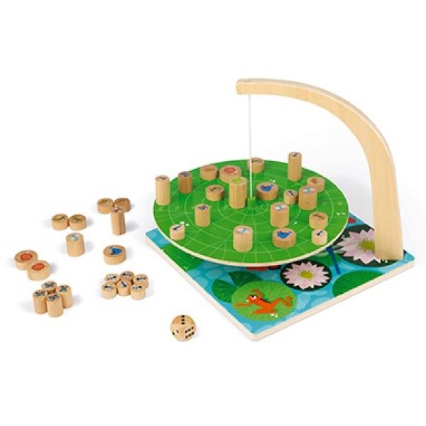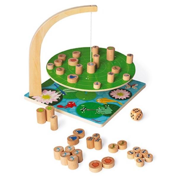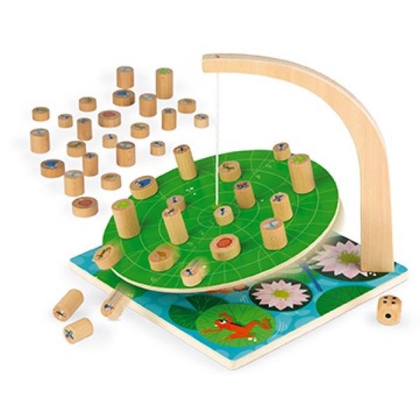 Obsah balení a příprava: Balení obsahuje dřevěnou základní desku s visícím leknínem, 42 ks dřevěných hracích figurek se zvířátky a 1 dřevěnou hrací kostku.