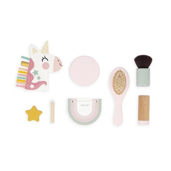 Dřevěný kosmetický stolek Janod Jednorožec je nádherný doplněk pro malé parádnice, které milují svět krásy a fantazie. Tento elegantní stolek s magickým jednorožcovým motivem obsahuje zrcadlo a množství doplňků na hraní, díky čemuž děti rozvíjejí kreativitu a jemnou motoriku.