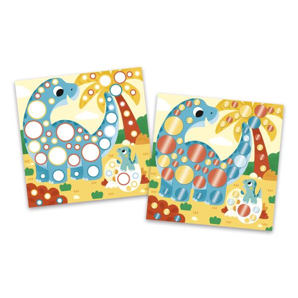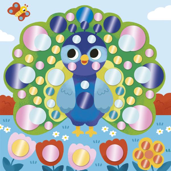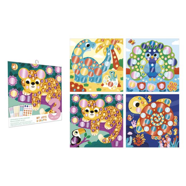 Tato sada na tvoření zahrnuje zdobení obrázků zvířat kovovými nálepkami ve tvaru teček. Obsahuje 4 podložky o rozměrech 20 x 20 cm (páv, dinosaurus, leopard a mořská želva), 4 listy kovových nálepek ve tvaru teček ve 3 různých velikostech (30, 20 a 10 mm) a leták s návodem a vzory. Tato aktivita pomáhá rozvíjet jemnou motoriku a trpělivost. Trvá přibližně 40 minut a je ideální pro děti od 3 let.