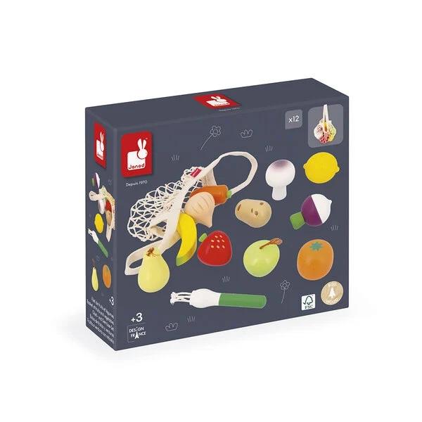 Sada Janod Shiny Grandma obsahuje 12 kusů dřevěného ovoce a zeleniny, které jsou uloženy v praktické síťce. Tato hračka je ideální pro děti, které si rády hrají na obchod, vaření nebo nakupování. Pomáhá rozvíjet kreativitu, jemnou motoriku a základní poznatky o zdravém stravování.