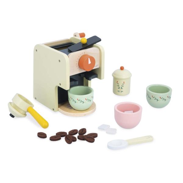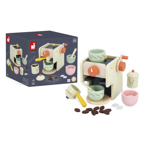 Máte chuť na šálek kávy? Tato imitace sady na vaření kávy je vhodná pro děti od 3 let a skládá se z kávovaru a 5 dřevěných doplňků: dost na to, abyste se stali skutečným baristou! Tato dřevěná sada, která je ideální jako doplněk do kuchyně a jídelního kouta, podněcuje představivost dětí, které milují napodobovat dospělé při přípravě vlastní kávy. Obsahuje: 2 šálky, 1 cukřenku s kostkovým cukrem, 1 konvici se zrnkovou kávou, 1 lžíci a samozřejmě 1 kávovar! Otevřete poklop v horní části hračkářského kávovaru, abyste mohli zasunout kávová zrna na mletí. Otočte kličkou na bok: jde zvedák, zvedák! Kávovou usazeninu zachyťte do malé zásuvky na zadní straně přístroje a umístěte ji do rukojeti filtru. Vložte rukojeť do kávovaru a otočte ji o čtvrt otáčky, abyste ji zajistili. Zbývá už jen nastavit délku kávy nebo teplotu pomocí slyšitelného otočného knoflíku na přední straně a káva je hotová! Nalévání kávy a cukru nebo manipulace s různými částmi kávovaru stimuluje dětskou motoriku. Napodobují gesta dospělých, aby získali jistotu ve svém každodenním životě. Kdo ví, možná vám brzy budou moci naservírovat vaši vlastní ranní kávu! Tento kávovar a jeho příslušenství jsou vyrobeny ze dřeva s certifikátem FSC™ z udržitelně obhospodařovaných lesů. Je součástí naší série Shiny Grandma: sada imitací hraček inspirovaných babiččiným vařením, prosáklá emocemi a vzpomínkami z dětství.
