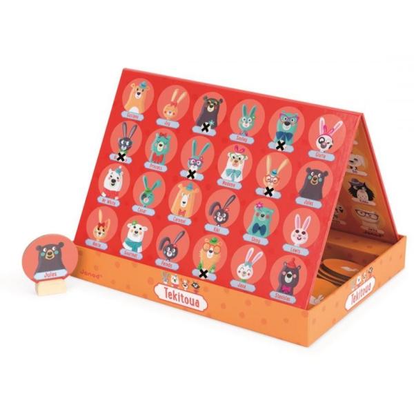 Dětská strategická Hádej kdo jsem! má motiv zvířátek, je v anglickém jazyce. Součástí balení je 48 kartiček, hrací plocha, podstavec, 48 odnímatelných nálepek. Cíl hry je vylučovací metodou uhodnout, jaké zvířátko má na kartičce protihráč. Hra je vhodná pro rozvoj logiky a strategického plánování, jemné motoriky dětí. K dispozici jsou 2 hrací úrovně: začátečníci, pokročilí. Krabice slouží jako podstavec. Pravidla strategické hry jsou následující: každý z hráčů si táhne 1 kartičku tak, aby ji ten druhý neviděl. Každý si pak vezme 24 nálepek a vzájemně hádají, jaké zvířátko je na kartičce protivníka. Kladením otázek se vylučují zvířátka na hrací ploše. Pokud je logické uvažování hráče správné, měl by se vylučovací metodou dostat k jednomu zvířátku – zvířátku, které má na kartě ten druhý hráč. Pro pokročilé je zde dodatečné pravidlo – prvních 5 otázek nesmí být o tom, jaké zvířátko má protihráč. Společenská hra je zaměřena na rozvoj strategického plánování a logického myšlení. Manipulací s nálepkami a kartičkami se rozvíjí také jemná motorika dětí. Pro děti od 5 let