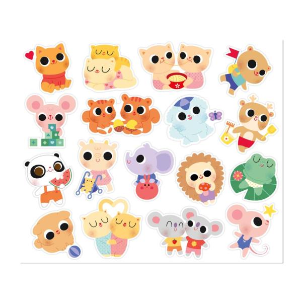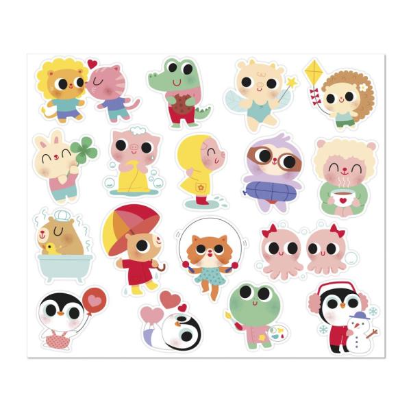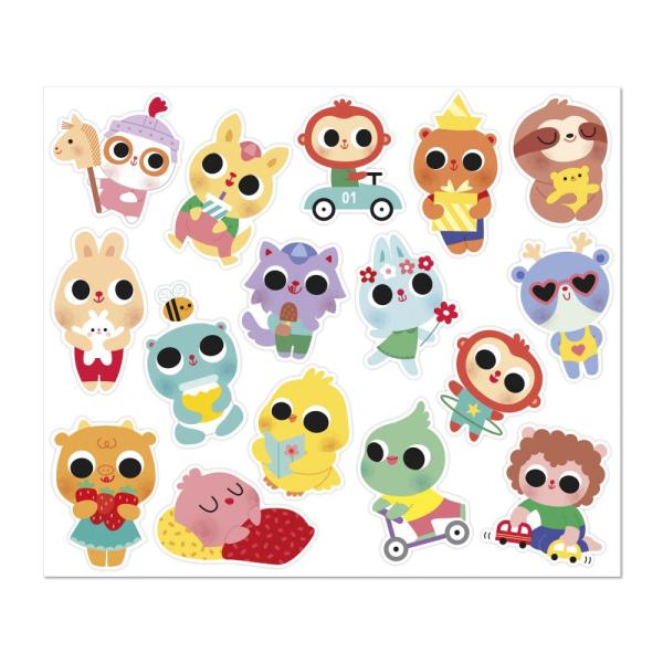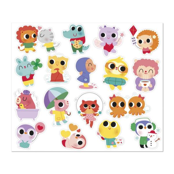 Samolepky jsou vhodné pro děti už od 18 měsíců – mají optimální velikost pro malé ručičky. Samolepky zobrazují roztomilé scénky ze života mladých zvířátek, např. Kapybara v koupeli, kuřátko na koloběžce nebo ježka pouštějícího draka.