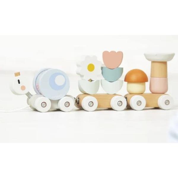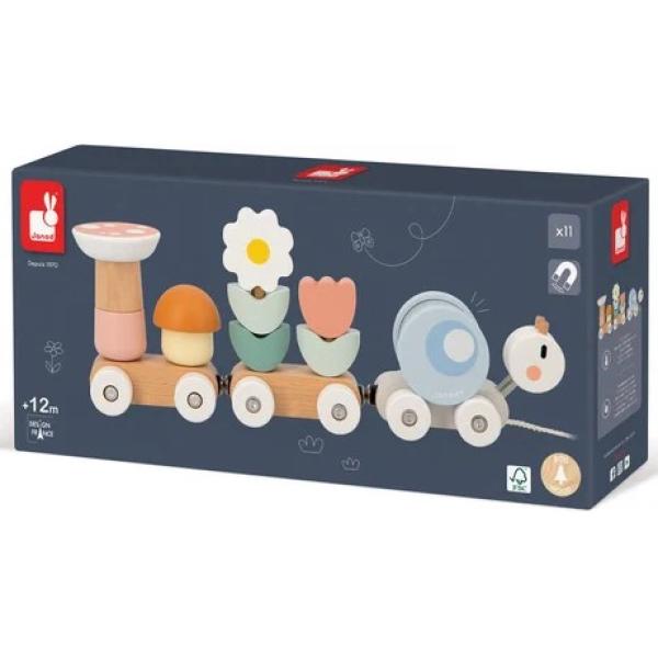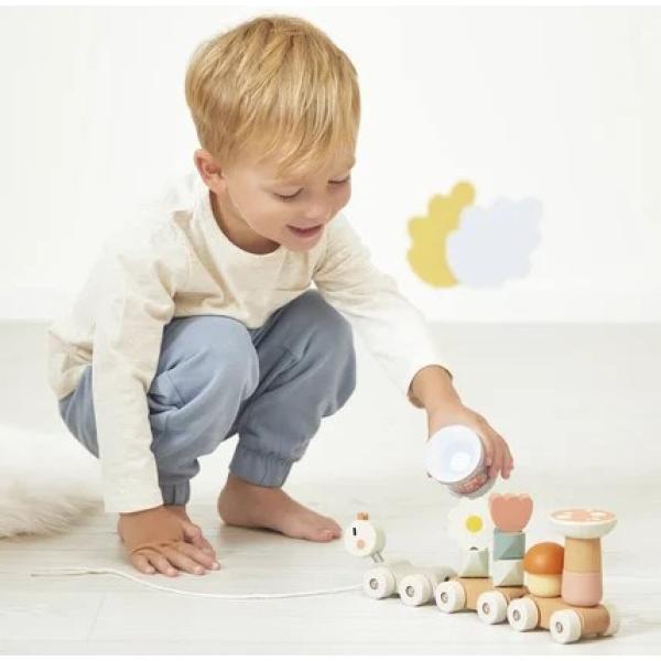 Tato dřevěná hračka na tahání nebo tlačení vnáší do her vašeho dítěte kouzlo. Skládá se ze 3 vagónů se 2 květinami a 2 houbami na přeskupení (10 kusů).