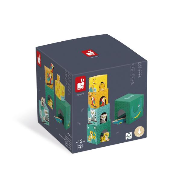 Vítejte v džungli! Tady je naše atraktivní pyramida složená z 5 kartonových bloků a 5 dřevěných zvířátek (krokodýl, jaguár, lemur, papoušek a žába). Každý blok představuje zvíře různé velikosti a je očíslován od 1 do 5, aby se děti mohly učit počítat a zároveň se bavit! Na boku počet zvířátek odpovídá číslu na bloku. Nakonec, díky ilustracím a otvorům, vaše dítě bude moci najít, který blok patří kterému zvířeti a schovat ho dovnitř. Rozvíjí jemnou motoriku a koordinaci ruka-oko. Hračka vyrobená z dřeva a kartonu s certifikátem FSCTM pro děti od 12 měsíců.