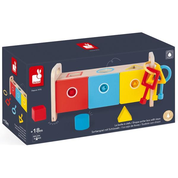 Dřevěná hračka na vkládání a třídění s klíčky a zámky Janod série Montessori Learning Toys.