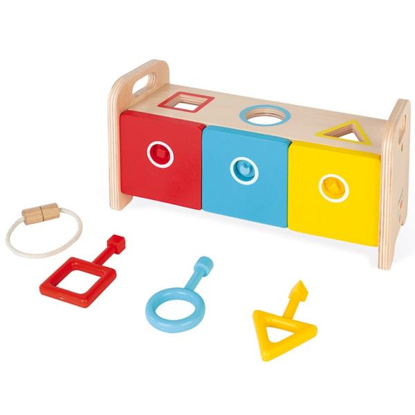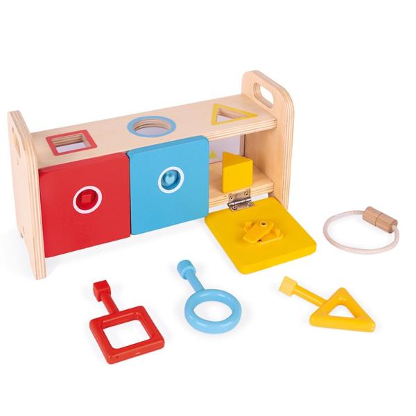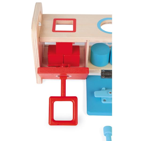 Dále se dítě může učit vkládat, poznávat barvy, tvary nebo počítat. Tato hra je vyrobena z masivního dřeva a obsahuje tři různé zámky k otevření.
