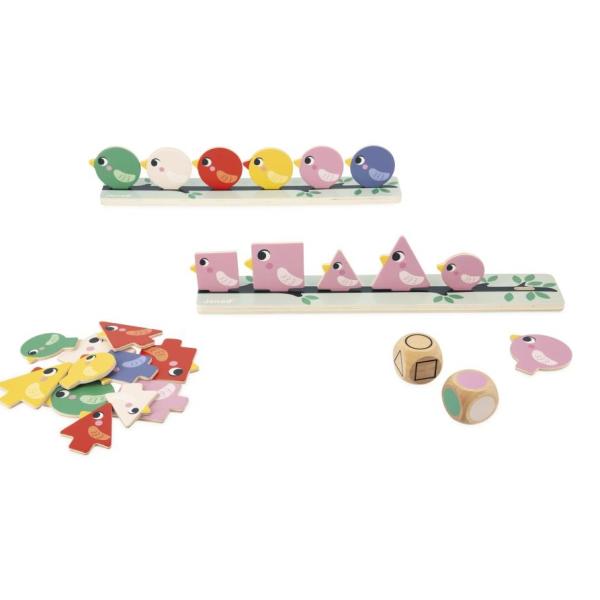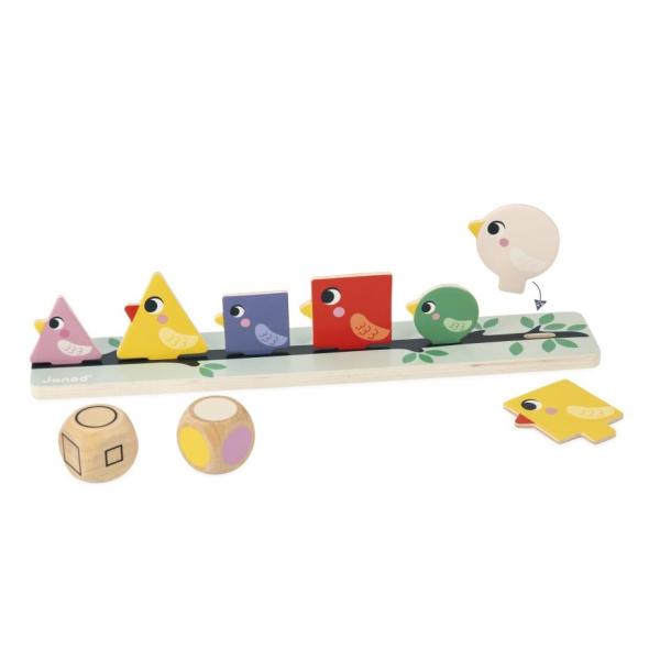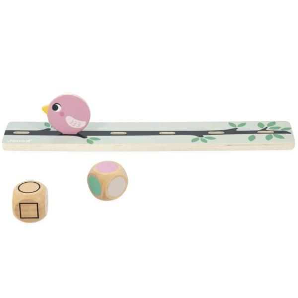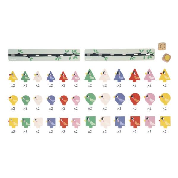 Skládá se ze dvou větví, 72 dřevěných ptáčků na umístění a 2 kostek (jedna s barvami a druhá s tvarovými a velikostními variacemi).