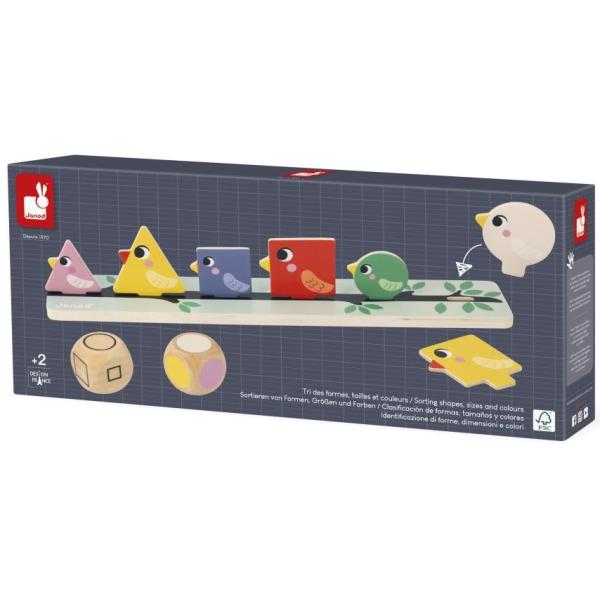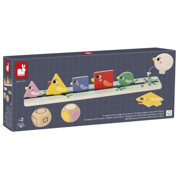 Vzdělávací dřevěná hra byla vyvinuta ve spolupráci s pedagogem pro děti od 3 let, je vhodná i pro děti v mateřské škole. Jaro je tu! Na stromech sedí ptáčci všech tvarů, barev a velikostí. Pomozte jim najít jejich místo na větvi.