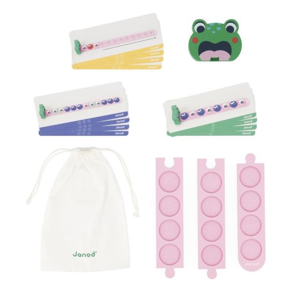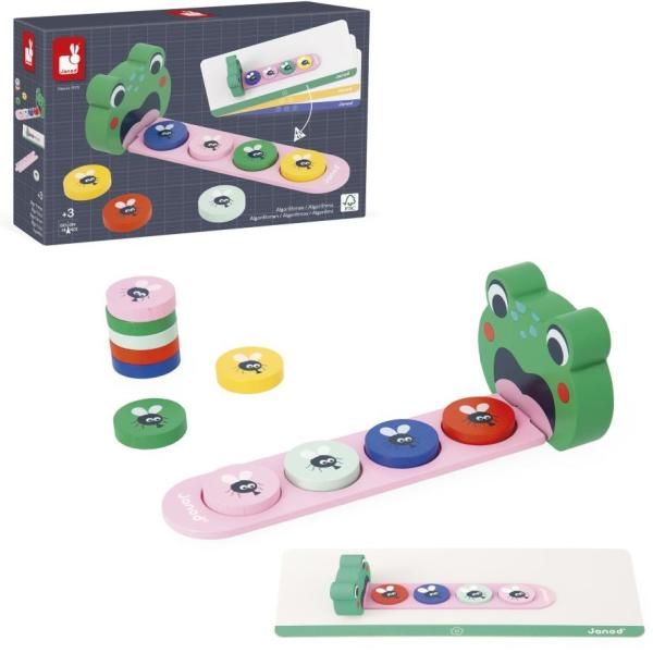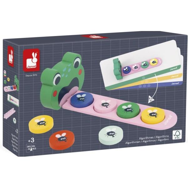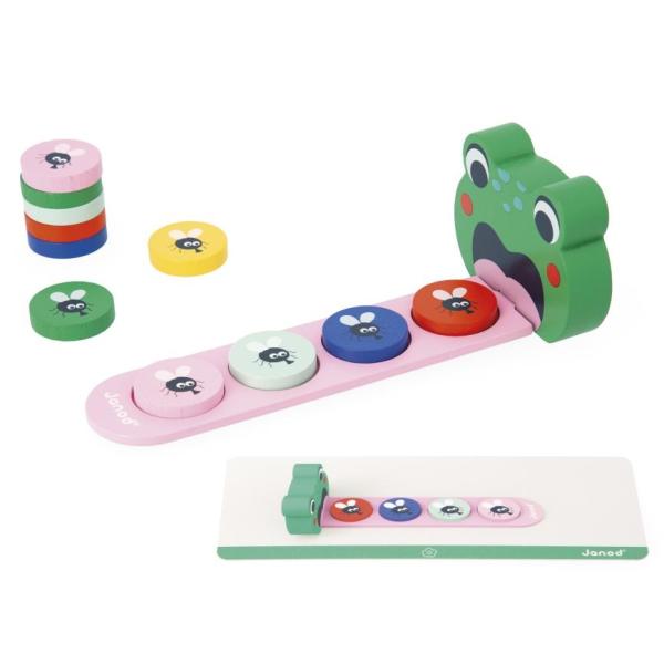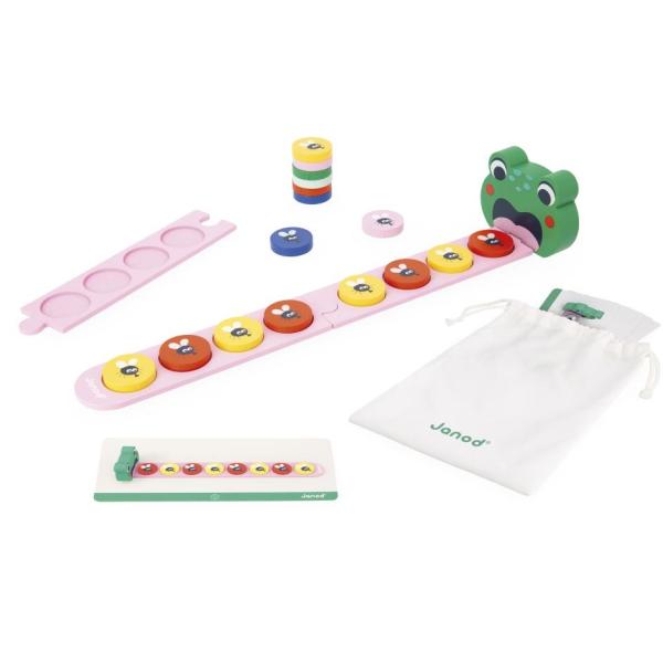 Edukační dřevěná hra je vyvinuta ve spolupráci s pedagogem pro děti od 3 let, je vhodná i pro děti v mateřské škole. Pro chamtivou žábu Froggy je čas oběda. Ale pozor, důležité je dávat jí mušky na jazyk opatrně, abys pochutnala vždy na něčem jiném! Tato vzdělávací hra umožní vašemu dítěti naučit se rozlišovat barvy a identifikovat logickou posloupnost. Existují 2 způsoby hry: Prvním je samostatná hra, během které musí vaše dítě reprodukovat logickou posloupnost barev podle obrázků na kartičkách. Druhý režim je spolupráce s rodičem: pomáhá vašemu dítěti učit se o algoritmech a zároveň sdílet zábavné chvíle. Tato hra se skládá z dřevěné žáby, jazyka rozděleného na 3 do sebe zapadající části, 36 much na barevných žetonech a 12 předlohových karet. Umisťováním much na jazyk žáby se vaše dítě zábavnou formou naučí, jak reprodukovat a identifikovat logickou posloupnost barev. Hračka vyrobena ze dřeva FSCTM a lepenky. Edukační hra vyvinutá ve spolupráci s učitelem školy pro děti od 3 let.