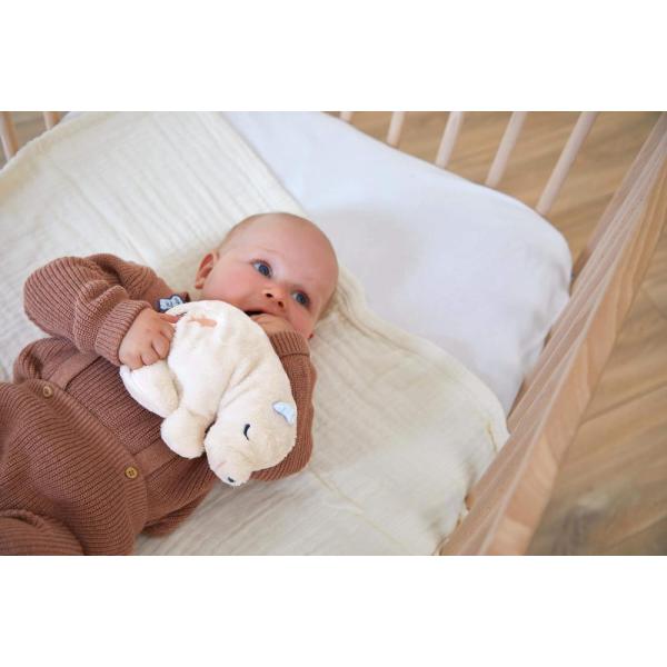 Jeho bříško zdobí potisk „Dance of the waves“ zdobený výšivkou ryb, která připomíná klid hlubokého moře a vlnu hebkosti a pohody, kterou přináší plyš. Jeho velkorysá velikost je ideální na zahřátí dítěte v posteli a uklidnění. Bez kapsy se používá jako přítulný plyšák.