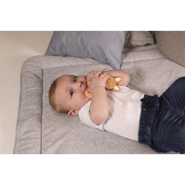 Jemné barvy a mix materiálů spojující jemnost silikonu a styl přírodního dřeva vaše dítě uklidní a stimuluje jeho pozornost, fantazii a představivost.