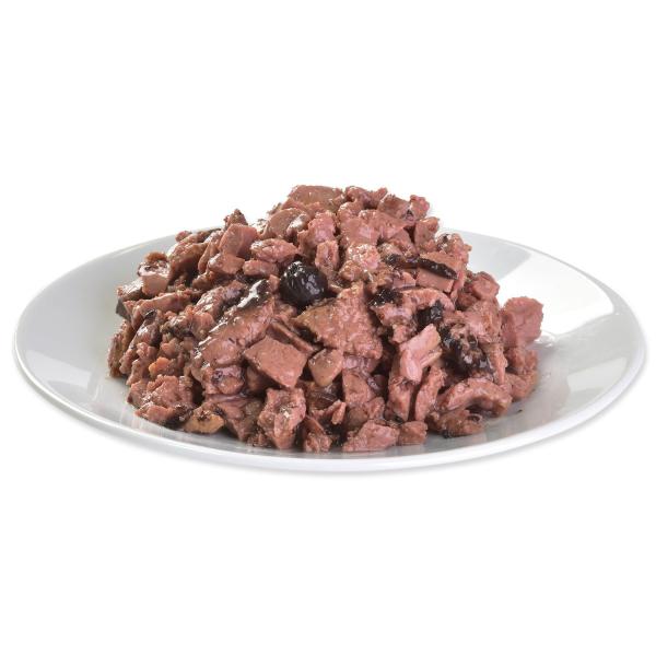 Kompletní superprémiové krmivo pro dospělé mini a malé plemena. Kousky masových filetek v delikátní omáčce jsou ideálním doplňkem ke granulím pro vylepšení jídelníčku vybíravých pejsků malých a miniaturních plemen. Vysoká chutnost. Obohaceno o prebiotika pro dobré trávení. Obsahuje rozmarýn, kurkumu, hřebíček, citrusy a borůvky. Maximálně vhodné pro vybíravé pejsky. Složení: 45% maso a vedlejší výrobky živočišného původu v filety (4% kuře), 35% ryby a výrobky rybího původu v filety (4% tuňák), 9,6% masová šťáva, 1,5% byliny a ovoce (hřebíček, citrusy, rozmarýn, kurkuma), 0,5% borůvky, 1% minerály, 1% lososový olej, 0,5% mannan-oligosacharidy, 0.5% frukto-oligosacharidy, 0,4% inulin. Analytické složky: hrubý protein 8%, hrubý tuk 4%, popel 2%, vláknina 0,4%, vlhkost 82%, vápník 0,3%, fosfor 0,2%, sodík 0,5%. Nutriční složení: vitamin D3 (E671) 250 IU, vitamin E (3a700) 100 mg, zinek (3b606) 15 mg, železo (3b103) 10mg, mangan (3b502) 3 mg, jód (3b251) měď (E4) 0.5 mg, biotin (3a880) 0,2 mg. Bez umělých aroma. Bez konzervantů. Metabolizovatelná energie: 820 kcal/kg