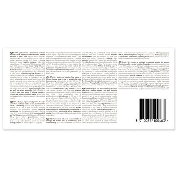 Kapsičky pro koťata s kuřecím masem v omáčce – k ompletnímu krmivu pro koťata. Krmný návod: koťatům ve věku do 20 týdnů věku podávejte cca. 3,5 kapsičky na kilogram váhy za den 4-6x denně, koťatům ve věku 20 až 40 týdnů cca. 2 kapsičky na kg váhy za den 3-4x denně, koťatům ve věku nad 40 týdnů cca. 1,25 kapsičky na kg váhy za den 2-3x denně. Vaše kočka může jíst více nebo méně v závislosti na věku, temperamentu a aktivitě. Složení: maso a živočišné deriváty (28% kuřecí maso, 6% vepřové maso), oleje a tuky (0,2% rybí olej), deriváty zeleninového původu (0,6% vláknina z cukrové řepy), minerály. Jakostní znaky: hrubé proteíny 8,6%, vlhkost 82,5%, hrubé oleje a tuky 4,1%, hrubé popeloviny 1,8%, hrubá vláknina 0,24%, vitamin D 200 mj/kg, vitamin E (alfatokoferol ) 100 mg/kg, měď (síran měďnatý pentahydrát) 1,9 mg/kg, jód (jodid draselný) 0,38 mg/kg, mangan (síran manganatý monohydrát) 2,1 mg/kg, zinek (síran zinočnatý monohydrát) 32 mg / kg. Bez barviv a příchutí.