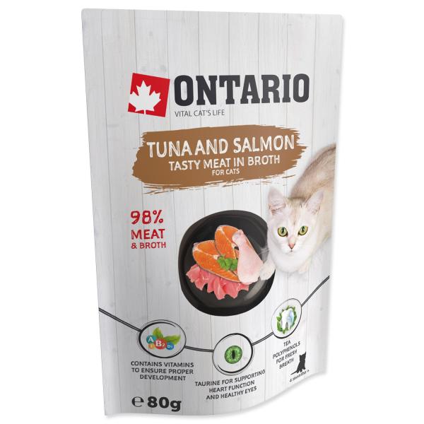 Kapsička Ontario tuňák a losos ve vývaru 80g – doplňkové krmivo pro kočky s přidaným výživovým obsahem pro zdravé srdce a zrak.