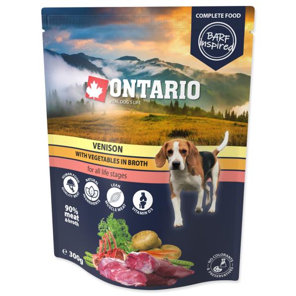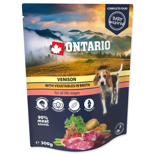 Kapsička Ontario zvěřina se zeleninou ve vývaru – kompletní krmivo pro psy všech věkových skupin, inspirované Barfem. Jemně mleté maso, brambory, hrachu a mrkve ve voňavém vývaru.