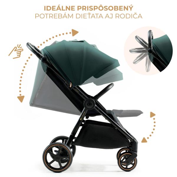 Sportovní kočárek KINDERKRAFT SELECT Mitzy v elegantní jade green barvě přináší pohodlí a styl na každé procházce. S plným odpružením a prostorným sedadlem je ideální pro děti až do 27 kg.