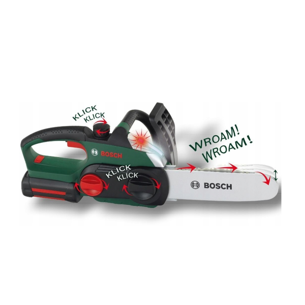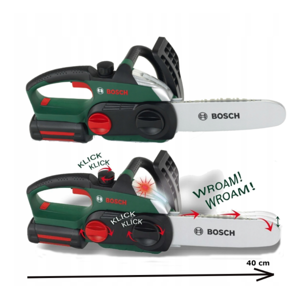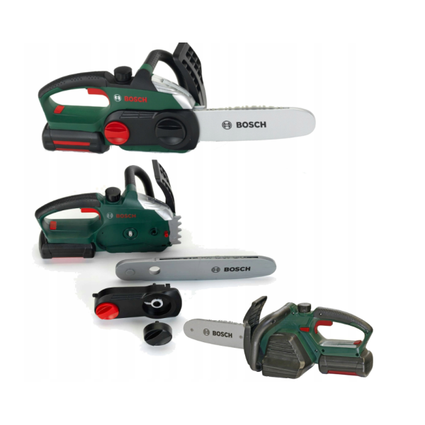 Tato bezdrátová pila pracující na baterie je ve tmavě zelené barvě s černými, stříbrnými a červenými prvky, opatřená červeným logem Bosch. Vyrobena pevně a s důrazem na detail, věrně napodobuje skutečné zařízení. Je vybavena: