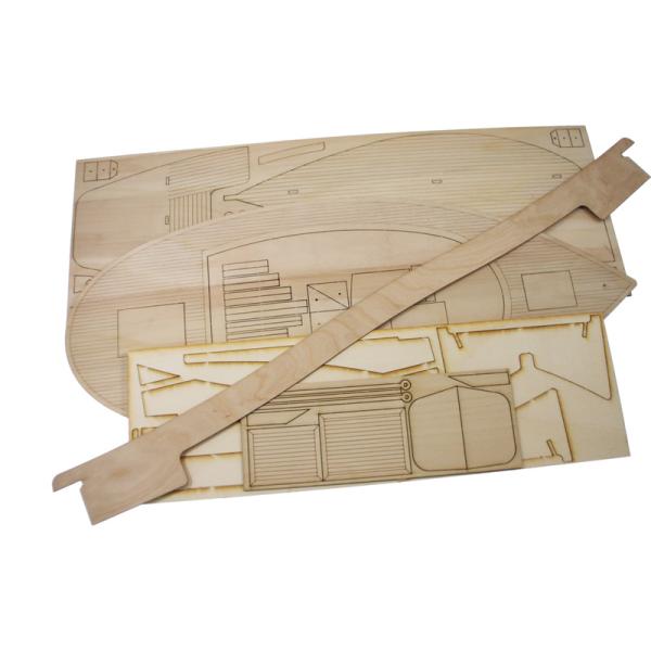 Po otevření víka krabice naleznete výlisek trupu z ABS, dřevěné díly modelu z překližky, sadu lišt, drobné součásti uzavřené v sáčcích, sadu výkresů a manuál.
