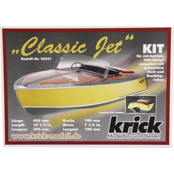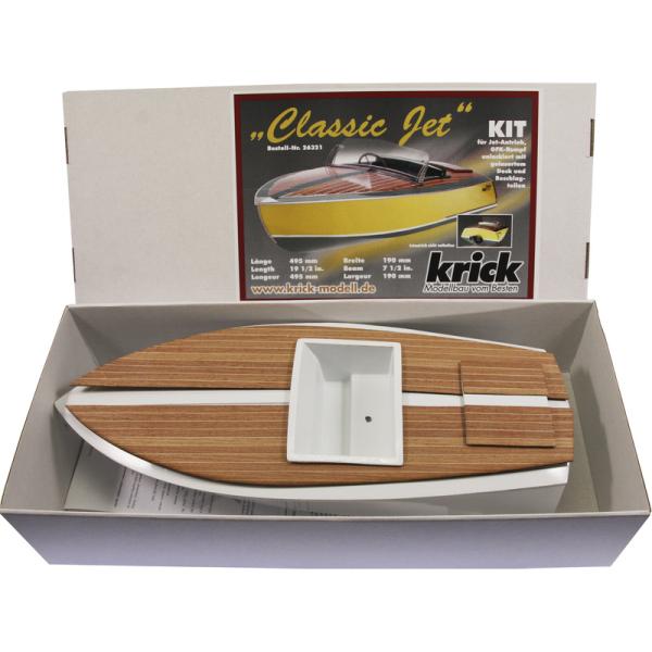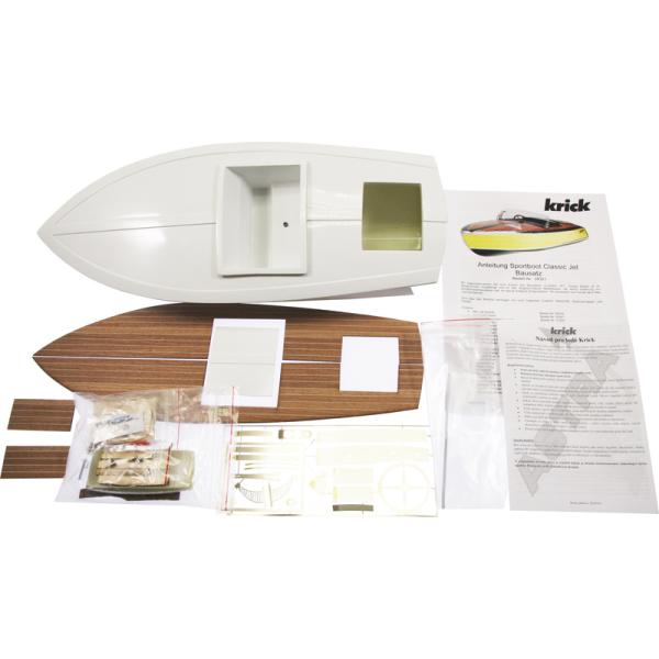 Charakteristika:Stavebnice rychlého model retro člunu Krick Classic Jet Kit. Model je třeba sestavit, obsahuje laminátový trup se základním nátěrem a výřezy pro Jet trysku. Stavebnice je určena pro zkušenější modeláře, protože kromě sestavení je potřeba model nabarvit a vybavit pohonem a RC soupravou.