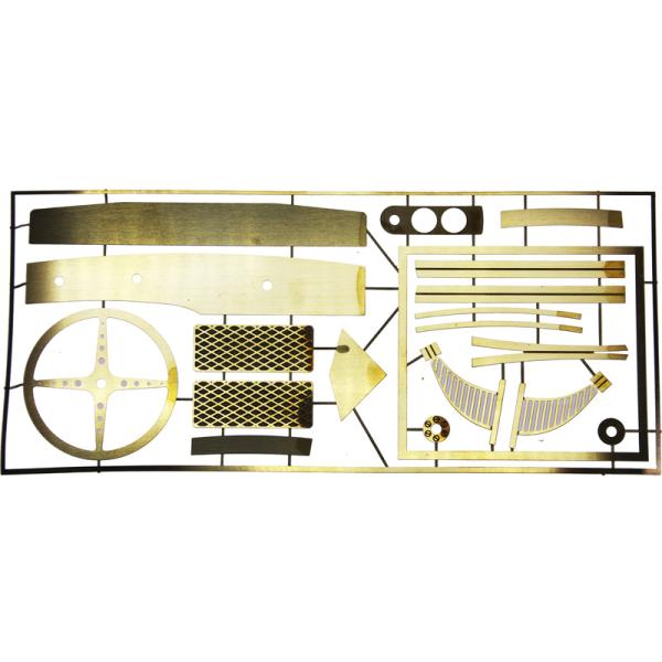 Po otevření víka krabice naleznete laminátový trup, laminátové kryty paluby, dřevěné díly modelu z překližky, drobné součásti uzavřené v sáčcích a manuál.