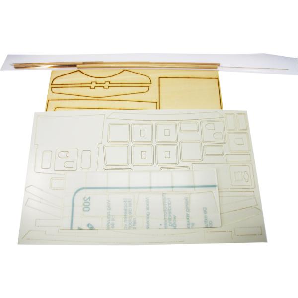 Po otevření víka krabice naleznete dřevěné díly modelu z překližky, plastové výlisky pro stavbu trupu a nástaveb, sadu lišt, drobné součásti uzavřené v sáčcích, sadu výkresů a manuál.