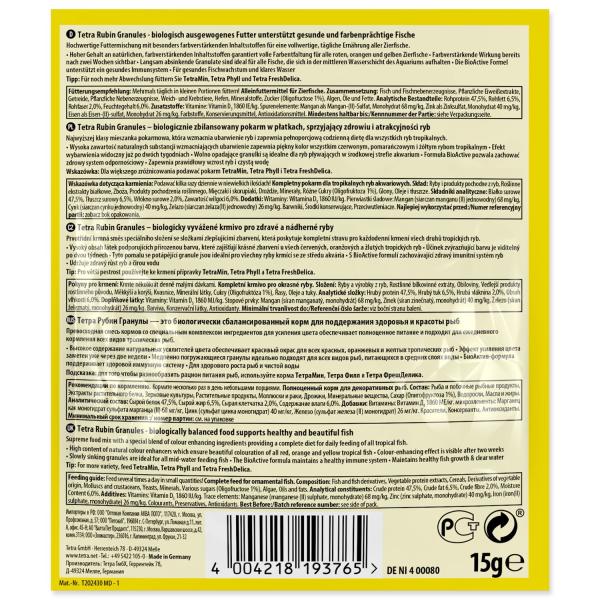 Granulované kompletní krmivo pro zvýraznění barevnosti všech druhů akvarijních ryb. Pomalu klesající granule zaručují plnohodnotnou a pestrou výživu, přírodní barevné aktivátory plně rozvíjejí přirozené zabarvení. Krmný návod: Krmte několikrát denně jen tolik, kolik ryby spotřebují během několika minut. Složení: ryby a vedlejší rybí produkty, rostlinné bílkovinné extrakty, obilí, vedlejší produkty rostlinného původu, měkkýši a korýši, kvasinky, minerální látky, řasy, oleje a tuky, L-lysin, monohydrochlorid, lecitin, kyselina citrónová. Jakostní znaky: proteiny 47,5%, vlhkost 6%, tuky 6,5%, hrubé popeloviny 10,5%, hrubá vláknina 2%, vitamin A 29770 mj/ kg, vitamín D3 1860 mj/ kg, vitamín E (alfatokofer 200 mg / kg, L-askorbyl-2-polyfosforečnan (stabilizovaný vitamin C) 137 mg / kg.
