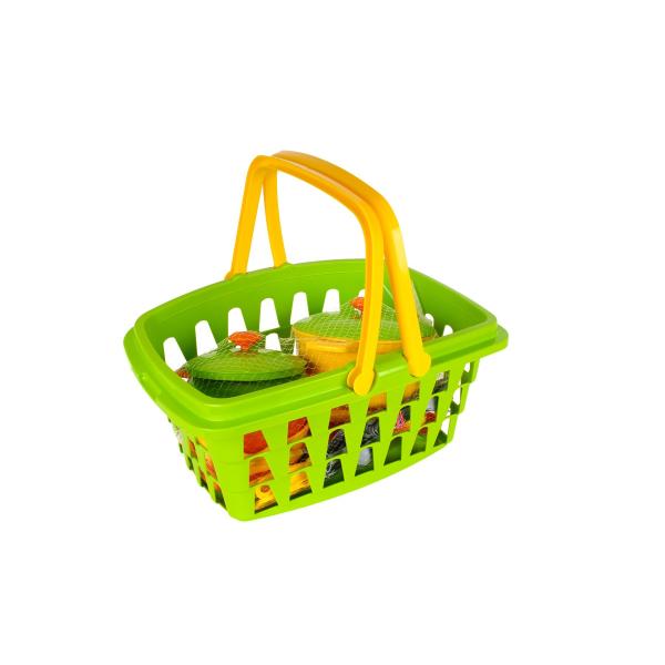 Se sadou hrnců, talířů a příborů si mohou malí kuchaři a kuchařky vařit co se jim zlíbí. Všechno mohou schovat do nákupního košíku. Rozměr košíku: 27 x 37 x 17 cm Vhodné od 3 let