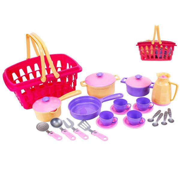 Kuchyňský set s košíkem s 25ks nádobí – perfektní hračka pro rozvoj jemné motoriky a kreativního myšlení dětí. Bezpečný a odolný plast, pohodlný košík s pohyblivými rukojeti.