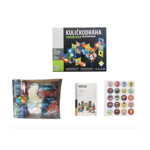 „Vytvoř si vlastní kuličkovou dráhu a zažij nekonečnou zábavu při stavění, hraní a objevování! Tato kreativní stavebnice ti umožní postavit různé scény, trojrozměrné struktury, nebo si zahrát různé hry, jako je domino, nebo zjistit, která kulička bude první v cíli. Dráha je vybavena světelnými efekty, které fungují díky LR1130, LR41 a CR1220 bateriím (nevyměnitelné, jednorázové použití),